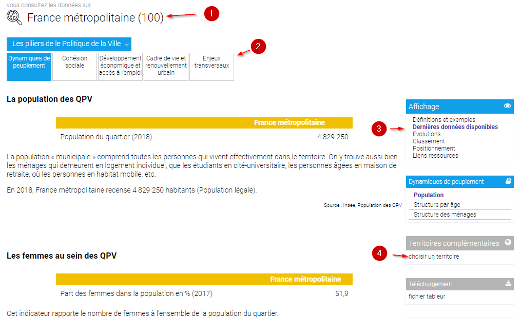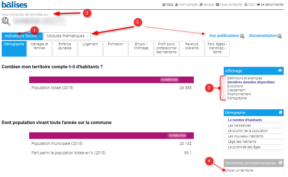 - Navigation dans les données et dans les ressources par les menus "Indicateurs socles" et "Documentation"